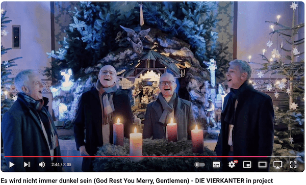 Mit dem Studio-Projekt „Es wird nicht immer dunkel sein!“ und diesem Video dazu wünschen euch DIE VIERKANTER frohe Weihnachten! Auf Facebook haben wir dazu auch eine Spendenaktion gestartet ( — link zur Facebook-Aktion — ), wo es heißt Teilen=Spenden. Wir freuen uns sehr, wenn ein namhafter Betrag zu Stande kommt. Ein frohes und gesegnetes Weihnachtsfest wünschen euch